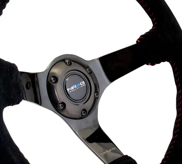 Affordable NRG Reinforced Steering Wheel (350mm / 3in. Deep) Blk Suede w/Red BBall Stitch & Black 3-Spoke