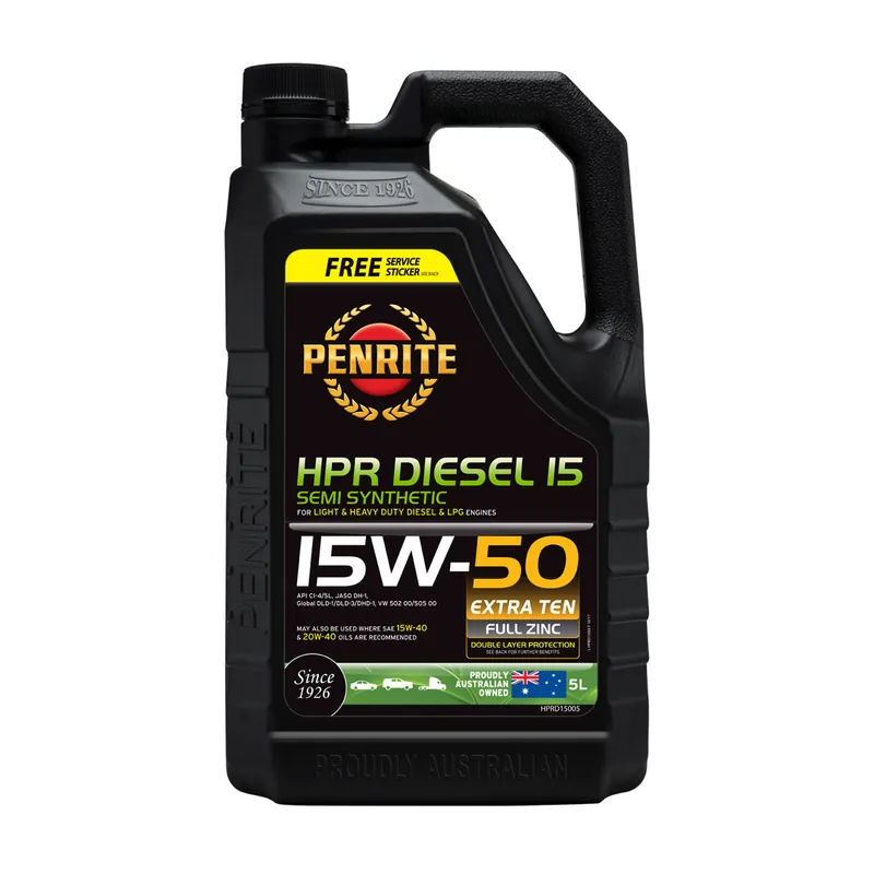 HPR Diesel 15 is a premium high performance semi synthetic SAE 15W-50, non-friction modified engine oil. It features a DOUBLE LAYER of engine wear protection with FULL ZINC and Penrites advanced EXTRA TEN technology. It contains a combination of high technology additives, including increased dispersant levels and low shear viscosity modifiers. It protects against corrosion, oil oxidation and sludge under all operating conditions.HPR Diesel 15 is recommended for use in vehicles where SAE 15W-40, SAE 15W-50 or SAE 20W-40 grade engine oils were originally recommended by the manufacturer.APPLICATIONHPR Diesel 15 is designed for use in modern 4, 6 & 8+ cylinder multi cam, multi valve (Including VVT), naturally aspirated, supercharged, turbocharged common rail and direct injection engines.It can be used where API CI-4, Global DLD-1, DLD-3, DHD-1 or JASO DH-1 are specified in the owners hand book. It can also be used where ACEA A3/B3, ACEA A3/B4 or ACEA E7 is recommended in model years prior to 2017. It is suitable for use in many older diesel and LPG powered vehicles requiring an engine oil meeting API CH-4, CG-4, CF-4 or older specifications.HPR Diesel 15 is NOT recommended for use in diesels fitted with a DPF (Diesel Particulate Filter) that require an ACEA C grade Low-Mid SAPS (Sulphated Ash, Phosphorus & Sulphur) engine oil. We recommend checking the recommendation guide for the correct grade and specification.EXTRA TEN TECHNOLOGYHPR Diesel 15 features Penrites Extra Ten Technology in the oils operating temperature viscosity that provides better wear protection, oil pressure and reduced oil consumption at operating temperature. It provides an added layer of protection for engines that are under high load conditions, competition, operating in high ambient temperatures or showing signs of excessive oil consumption.VEHICLE & FUEL TYPESHPR Diesel 15 is suitable for use in diesel engines in passenger cars, motorcycles, 4WDs, light & heavy duty commercial engines in trucks, tractors, agricultural & earthmoving equipment as well as industrial equipment such as fork lifts & stationary engines. It can be used with Diesel & Petrol/E10/LPG (Dual Fuel). Suitable for petrol and LPG engines as a mixed fleet oil and can be used in motorcycles with wet clutches.IMPORTANT INFORMATION WHEN CHANGING OILNOTE: when changing oil, Penrite recommend using Penrite Engine Flush, a fast acting, solvent free, engine cleaning formulation that removes engine deposits, sludge and contaminants with the oil service drain. It contains added zinc for engine wear protection and its fast acting formulation works in 10 minutes.