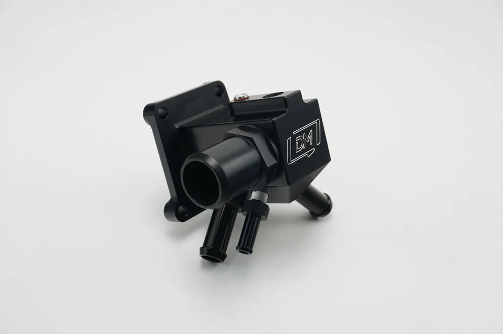 The Damond Motorsports Mazdaspeed Water Outlet Manifold is the perfect addition for serious racers and those wanting to clean up their engine bay. Machined out of 6061 aluminum and anodized black, this billet piece takes up a considerably less space compared to the original equipment cast piece. Our Water Outlet Manifold also features additional ports for adding in sensors of your choosing, and allows you to plug ports you don’t need in racing applications, such as the heater core and thermostat bypass. Fittings and plugs are available to configure this manifold for your needs. Key features: Custom machined factory sized radiator hose o-ring boss fitting (ORB for short). ORB to hose barb fittings for the thermostat bypass hose and heater core hose OE sensor port. 2 x Additional 1/8\\
