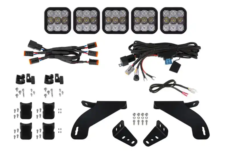 FeaturesBolt-on fitment compatible with Ford F-150 2021+ Ultra-high intensity, with custom-engineered TIR optics Selectable backlight color, with eight color options Torture-tested, heavy-duty construction Control through factory aux switch bank using the included harness Assembled in USA Overview Perfect Fitment. The Grille CrossLink Lightbar Kit compatible with Ford F-150 2021+ from Diode Dynamics allows you to mount five linked SS5 LED pods on the factory grille. These application-specific brackets were CAD-designed to bolt into place using factory mounting points on the grille. No cutting or drilling required! Designed for Performance. Featuring the highest output intensity of any 5-inch LED pod on the market, these lamps have been designed for maximum functionality, with patented technology and custom-engineered TIR optics, all in a durable package. Selectable Backlight. The Stage Series 5inch LED Pods included in the White kit feature a selectable backlight with eight different color options, perfect for an extra styling accent, or for more visibility when you’re not using the main beam. Selecting your backlight color is easy – simply alternate the power on and off. There’s no complicated programming with a controller! The SS5’s backlight fully illuminates the TIR optic, providing unique accent lighting that you won’t find on other LED pods. NOTE: Due to the yellow lens, the Yellow kit is only available with an Amber backlight color. CrossLink. Our patent-pending CrossLink technology allows you to link up to eight SS5 pods together to create your own lightbar. The single-piece CNC aluminum link provides extreme rigidity, but is fully adjustable. This kit was designed for a curved configuration.