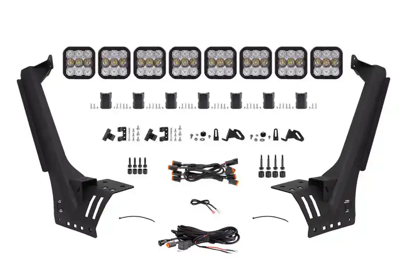 FeaturesBolt-on fitment compatible with Jeep JL Wrangler 2018-2021 Ultra-high intensity, with custom-engineered TIR optics Selectable backlight color, with eight color options Torture-tested, heavy-duty construction Control through factory aux switch bank using the included harness Assembled in USAOverview Perfect Fitment. The Windshield CrossLink Lightbar Kit compatible with Jeep JL Wrangler 2018-2021 from Diode Dynamics allows you to mount eight linked SS5 LED pods above the factory windshield. These application-specific brackets were CAD-designed to bolt into place using factory mounting points above the factory windshield. No cutting or drilling required! Designed for Performance. Featuring the highest output intensity of any 5-inch LED pod on the market, these lamps have been designed for maximum functionality, with patented technology and custom-engineered TIR optics, all in a durable package. Selectable Backlight. The SS5 LED Pods included in the White kit feature a selectable backlight with eight different color options, perfect for extra styling, or for more visibility when you’re not using the main beam. Selecting your backlight color is easy – simply alternate the power on and off. There’s no complicated programming with a controller! The SS5’s backlight fully illuminates the TIR optic, providing unique accent lighting that you won’t find on other LED pods. NOTE: Due to the yellow lens, the Yellow kit is only available with an Amber backlight. CrossLink. Our patent-pending CrossLink technology allows you to link up to eight SS5 pods together to create your own lightbar. The single-piece CNC aluminum link provides extreme rigidity, but is fully adjustable, for both straight and curved configurations.