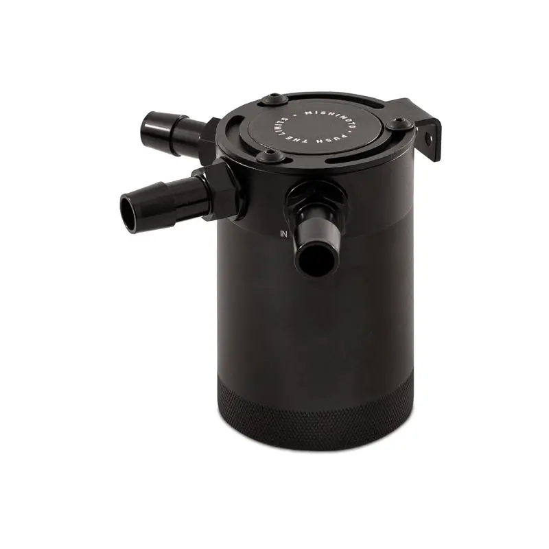 Mishimoto is proud to announce the release of our Compact Baffled Oil Catch Can, available in a two-port or three-port option. With years of oil catch can research and development time, Mishimoto has created the most effective compact oil catch can on the market. The Mishimoto Compact Baffled Oil Catch Can was designed to separate oil particles from the PCV/CCV air that would normally have just been routed back to your intake. The internal air diverter turbulates the air longer and ensures all the oil sinks to the bottom of the can, leaving nothing but clean air to pass through the 50 micron bronze filter to the intake. An internal baffle keeps the collected oil from splashing around under race conditions. This oil catch can features two ports, one inlet and one outlet, for easy installation on CCV and PCV systems. The 100-percent billet, 6061 aluminum can features 3/8in NPT threads at the inlet, outlet, and drain area and includes two black nylon fittings to make installation effortless. For maximum fitment options, the top mounting setup allows the can to be mounted from multiple angles. To make maintenance easy, the drain plug can be removed to allow for a return to the oil pan. The can is also 100-percent washable, unlike many other cans that require you to replace your filtration system.Our catch cans are different from most air-oil-separator (AOS) systems on a few levels. First, our catch cans are not heated. This means that all of the blow-by is able to condense in the can, including low-octane oil vapors and contaminated fuel vapors. Most AOS systems also drain the blow-by back into the oil pan, while our catch cans trap the blow-by and keep it out of the engine permanently. If you’ve seen what We’ve seen in the bottom of our catch cans, you won’t want that draining back into your oil either.