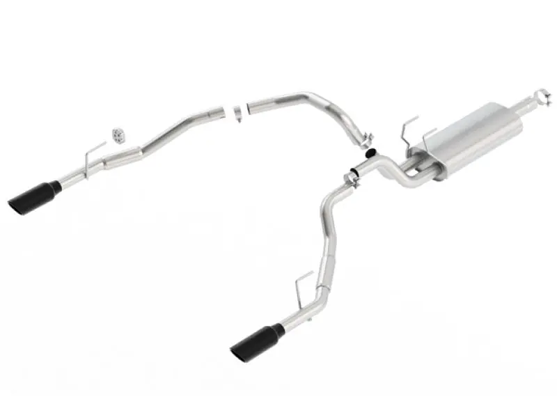 Converts vehicles with factory single exhaust to dual exhaust. Fits underneath the factory bumper. This 3″ diameter into dual 2.5″ Cat-Back™ system features the classic S-type sound with no drone inside the vehicle and exits thru single 4″ round black chrome on T-304 stainless steel tips. Using BORLA® Stainless Steel Polish p# 21461 is NOT recommended with these black chrome tips. We suggest cleaning the tips with hot water and a microfiber cloth. A system with bright chrome onT-304 stainless steel tips is also available. BORLA® Cat-Back™ and Axle-Back exhaust systems feature patented straight-through and multi-core technology designed to unleash hidden horsepower. Increased exhaust velocity adds power, driving excitement, fuel economy, and the distinctive BORLA® Sound of Power respected by motoring enthusiasts everywhere. Each system is built from premium, high-quality austenitic T-304 stainless steel, superior to T-400 series knockoffs (such as 409), to give you the absolute best in performance and durability. Ultra-smooth mandrel bends ensure maximum flow & power, and precision computer numerical control (CNC) manufacturing ensures an accurate fit. Best of all, BORLA® stands behind every system with a Million-Mile Warranty. Just what you’d expect from the world’s most experienced (and most winning) exhaust brand.