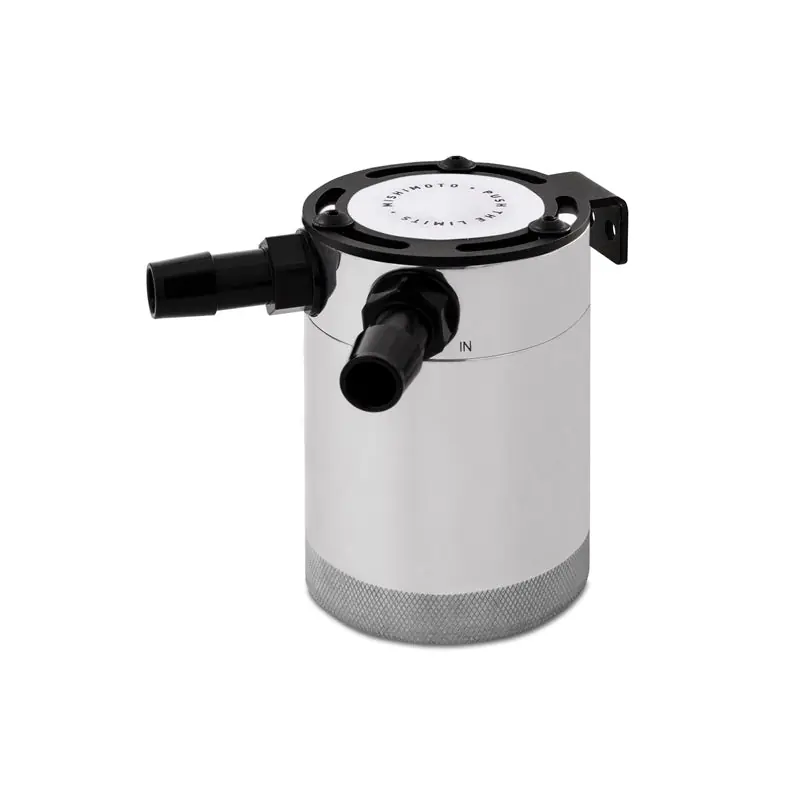 Mishimoto is proud to announce the release of our Compact Baffled Oil Catch Can, available in a two-port or three-port option. With years of oil catch can research and development time, Mishimoto has created the most effective compact oil catch can on the market. The Mishimoto Compact Baffled Oil Catch Can was designed to separate oil particles from the PCV/CCV air that would normally have just been routed back to your intake. The internal air diverter turbulates the air longer and ensures all the oil sinks to the bottom of the can, leaving nothing but clean air to pass through the 50 micron bronze filter to the intake. An internal baffle keeps the collected oil from splashing around under race conditions. This oil catch can features two ports, one inlet and one outlet, for easy installation on CCV and PCV systems. The 100-percent billet, 6061 aluminum can features 3/8in NPT threads at the inlet, outlet, and drain area and includes two black nylon fittings to make installation effortless. For maximum fitment options, the top mounting setup allows the can to be mounted from multiple angles. To make maintenance easy, the drain plug can be removed to allow for a return to the oil pan. The can is also 100-percent washable, unlike many other cans that require you to replace your filtration system.Our catch cans are different from most air-oil-separator (AOS) systems on a few levels. First, our catch cans are not heated. This means that all of the blow-by is able to condense in the can, including low-octane oil vapors and contaminated fuel vapors. Most AOS systems also drain the blow-by back into the oil pan, while our catch cans trap the blow-by and keep it out of the engine permanently. If you’ve seen what We’ve seen in the bottom of our catch cans, you won’t want that draining back into your oil either.