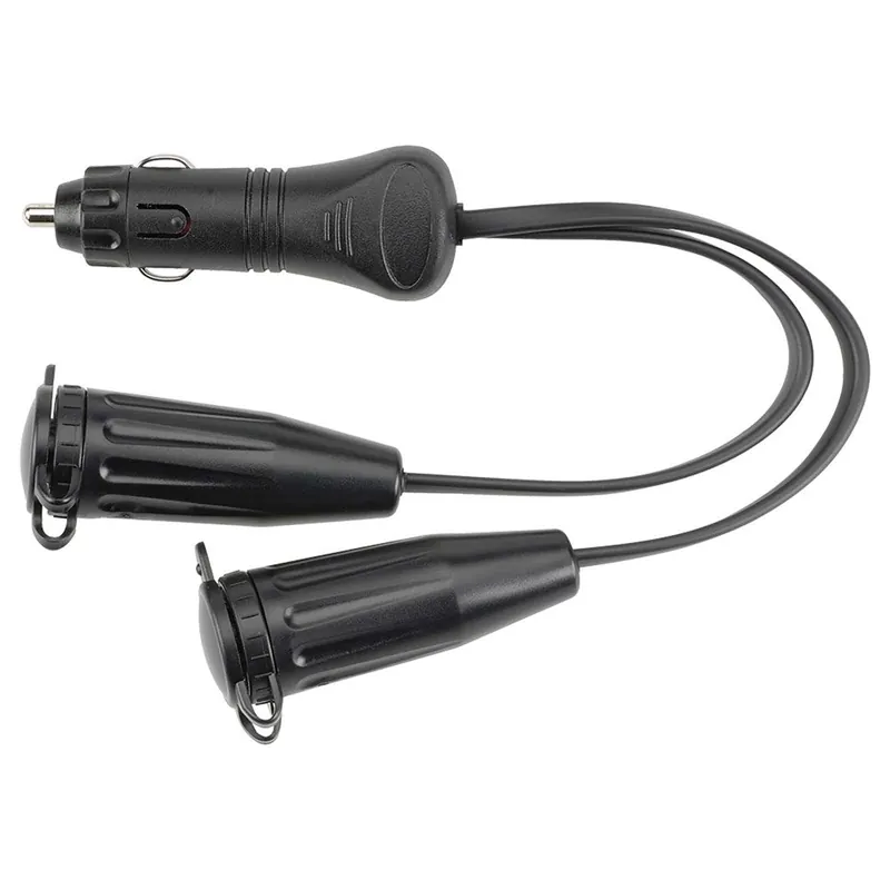 Heavy-Duty Adaptor (Cigarette Lighter Plug to Twin Merit Sockets). Ideal for powering multiple appliances with Merit plugs from a vehicle’s accessory socket. Features dustproof cover and 150mm straight lead. Amperage rating 16A at 12V, 8A at 24V