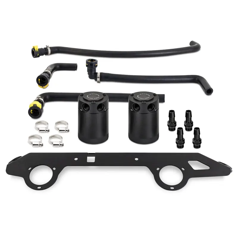 The legendary Ford Bronco has returned, and under the retro-styled hood lies a new legend: the 2.7L EcoBoost. The 2.7L EcoBoost has been powering Fords for nearly a decade and has become one of the most respected truck engines available. The second generation 2.7L features both port and direct injection for efficiency throughout the RPM range. While the added port injection helps clean the intake valves, it doesn’t protect the rest of your engine from the effects of blow-by.As blow-by flows through your intake, it coats components like sensors and your intercooler in a sludge of oil, carbon, and fuel, reducing their ability to function. Blow-by can also reduce the effectiveness of your engine oil. The factory air-oil-separator drains blow-by back into the oil pan, which is great for the environment, but the fuel and water in blow-by can thin your engine oil and reduce its viscosity. Finally, any blow-by that does make its way back into the cylinder can reduce the octane of your fuel and, for a high-strung turbocharged engine like the 2.7L EcoBoost, lower octane means less power.The solution to all those issues is to capture the blow-by and keep it out of the engine with a Mishimoto catch can system. Our direct-fit baffled oil catch can system for the 2021+ Ford Bronco 2.7L EcoBoost intercepts blow-by before it enters the intake and captures it to be recycled at your next oil change. This dual catch can system provides efficient oil/water separation for both the PCV and CCV systems on your Bronco.Our catch cans feature an internal baffle and air turbulators that help condense oil, fuel, and water vapor from the blow-by, as well as a 50-micron sintered bronze filter that captures carbon particles. Our catch can system features a sturdy 2.5mm-thick steel bracket and molded hoses which include Ford-specific quick-disconnect fittings for an easy and clean install. This catch can system is backed by our Mishimoto Lifetime Warranty for a lifetime of clean running.