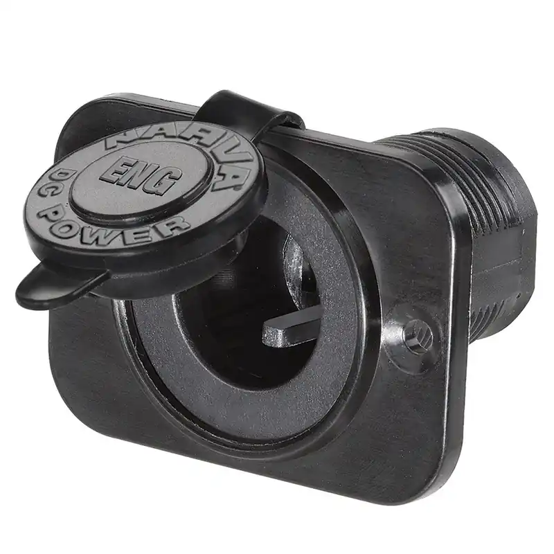 Heavy-Duty Engel Type Socket. Features dustproof cover and heavy-duty construction. Can be installed with or without the mounting panel. Amp rating 15A at 12V, 7.5A at 24V Mounting opening 29mm dia.