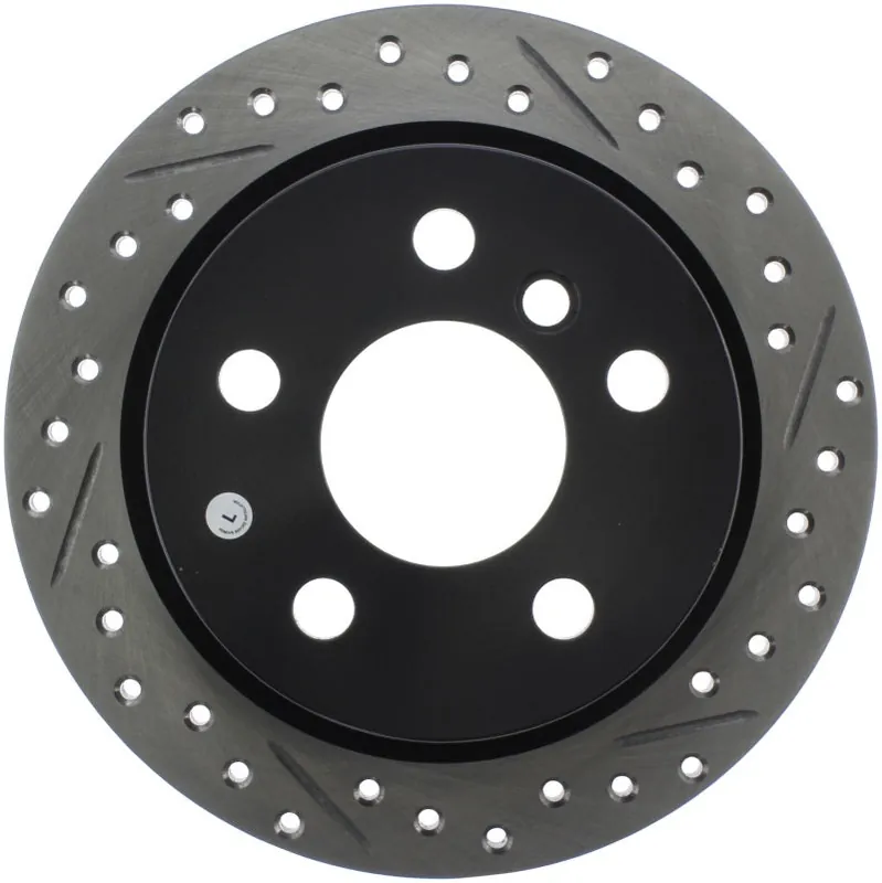 StopTech Drilled and Slotted Sport Rotors are 1-piece direct replacement brake discs for factory brake systems and stock calipers that look great behind your wheels – and offer significantly improved braking performance. The unique cross-drilling and slotting aids with heat and brake dust dispersal; prevents glazing of the pads; adds bite and improves wet and dry braking performance. Built to last; the black e-coating provides protection from corrosion and the high carbon metallurgy (in most applications) offers quieter operation; better crack resistance and increased performance.