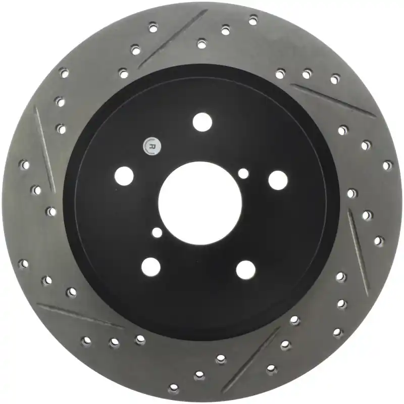 StopTech Drilled and Slotted Sport Rotors are 1-piece direct replacement brake discs for factory brake systems and stock calipers that look great behind your wheels – and offer significantly improved braking performance. The unique cross-drilling and slotting aids with heat and brake dust dispersal; prevents glazing of the pads; adds bite and improves wet and dry braking performance. Built to last; the black e-coating provides protection from corrosion and the high carbon metallurgy (in most applications) offers quieter operation; better crack resistance and increased performance.
