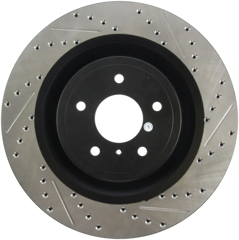 StopTech Drilled and Slotted Sport Rotors are 1-piece direct replacement brake discs for factory brake systems and stock calipers that look great behind your wheels – and offer significantly improved braking performance. The unique cross-drilling and slotting aids with heat and brake dust dispersal; prevents glazing of the pads; adds bite and improves wet and dry braking performance. Built to last; the black e-coating provides protection from corrosion and the high carbon metallurgy (in most applications) offers quieter operation; better crack resistance and increased performance.
