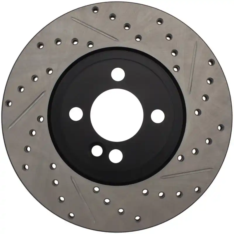 StopTech Drilled and Slotted Sport Rotors are 1-piece direct replacement brake discs for factory brake systems and stock calipers that look great behind your wheels – and offer significantly improved braking performance. The unique cross-drilling and slotting aids with heat and brake dust dispersal; prevents glazing of the pads; adds bite and improves wet and dry braking performance. Built to last; the black e-coating provides protection from corrosion and the high carbon metallurgy (in most applications) offers quieter operation; better crack resistance and increased performance.