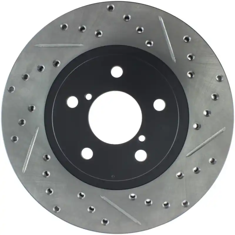 StopTech Drilled and Slotted Sport Rotors are 1-piece direct replacement brake discs for factory brake systems and stock calipers that look great behind your wheels – and offer significantly improved braking performance. The unique cross-drilling and slotting aids with heat and brake dust dispersal; prevents glazing of the pads; adds bite and improves wet and dry braking performance. Built to last; the black e-coating provides protection from corrosion and the high carbon metallurgy (in most applications) offers quieter operation; better crack resistance and increased performance.
